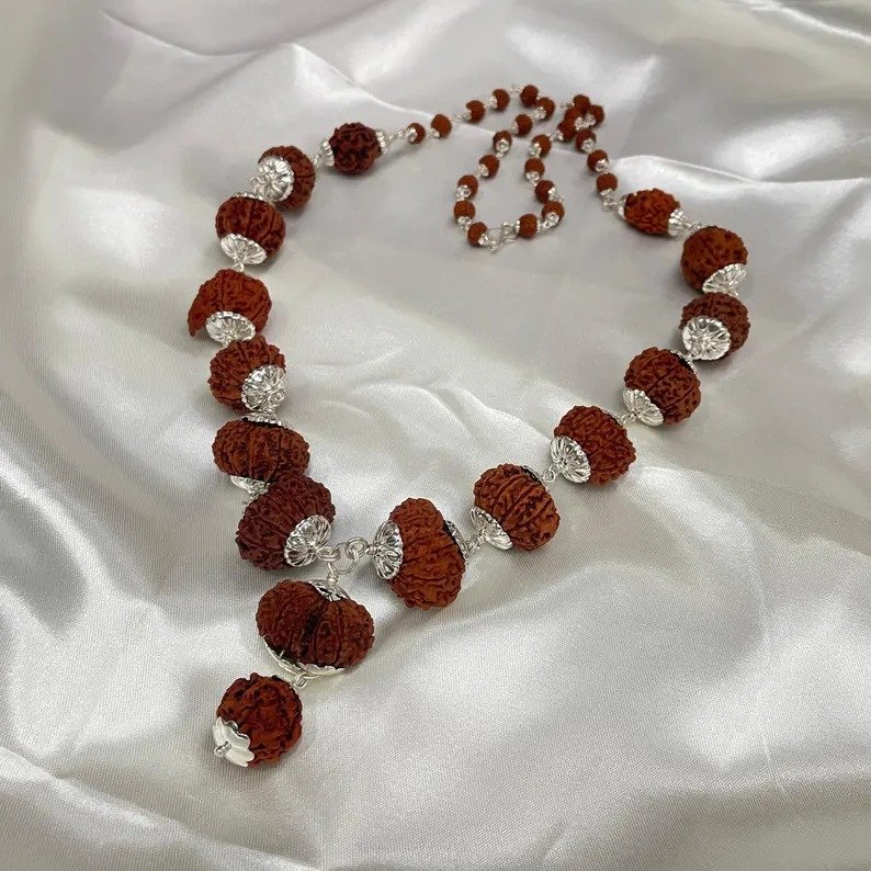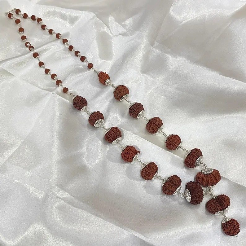 This exquisite sterling silver Rudraksha mala features rare Gauri Shanker and Ganesha beads, handpicked for high spiritual energy. Designed to enhance spiritual growth, emotional balance, and overall well-being, it also promotes mental clarity, protection, and prosperity. Wear it as a necklace or bracelet during meditation, puja, or daily life to experience divine benefits and inner peace.