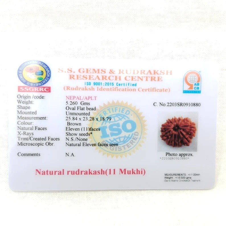 A Lab Certificate for an 11 Mukhi Rudraksha guarantees its authenticity, ensuring that it is a genuine, natural Rudraksha and not a synthetic or fake one.