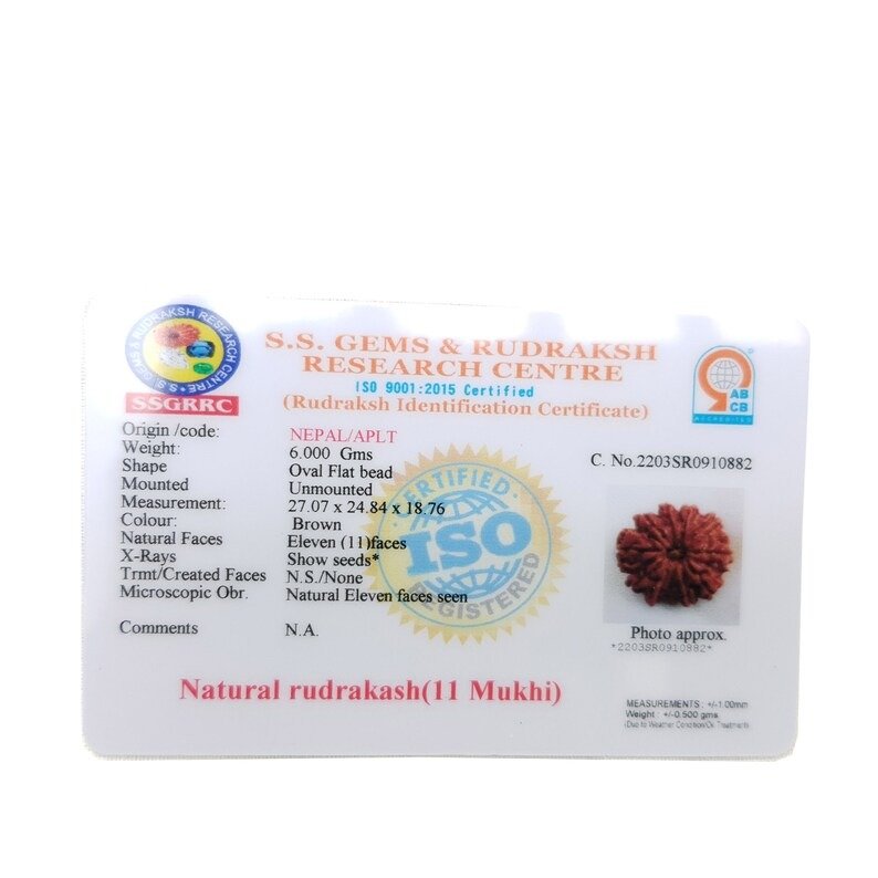 A lab certificate ensures the Rudraksha is genuine and natural, confirming its origin, size, weight, and the number of faces (Mukhi).