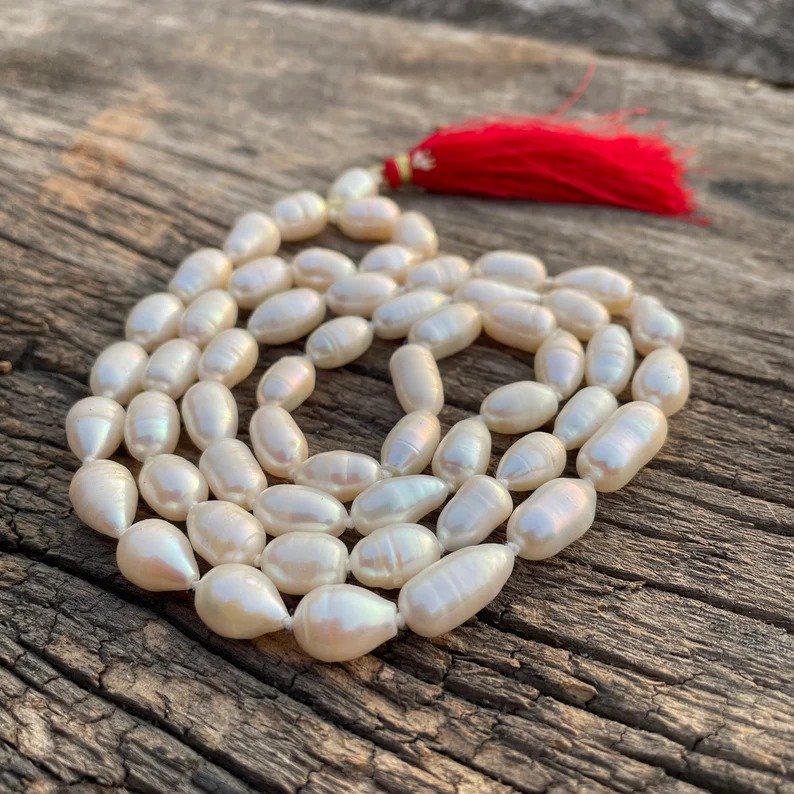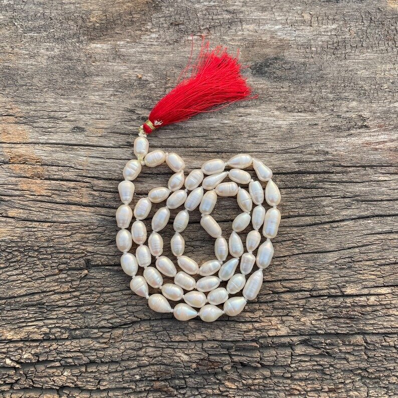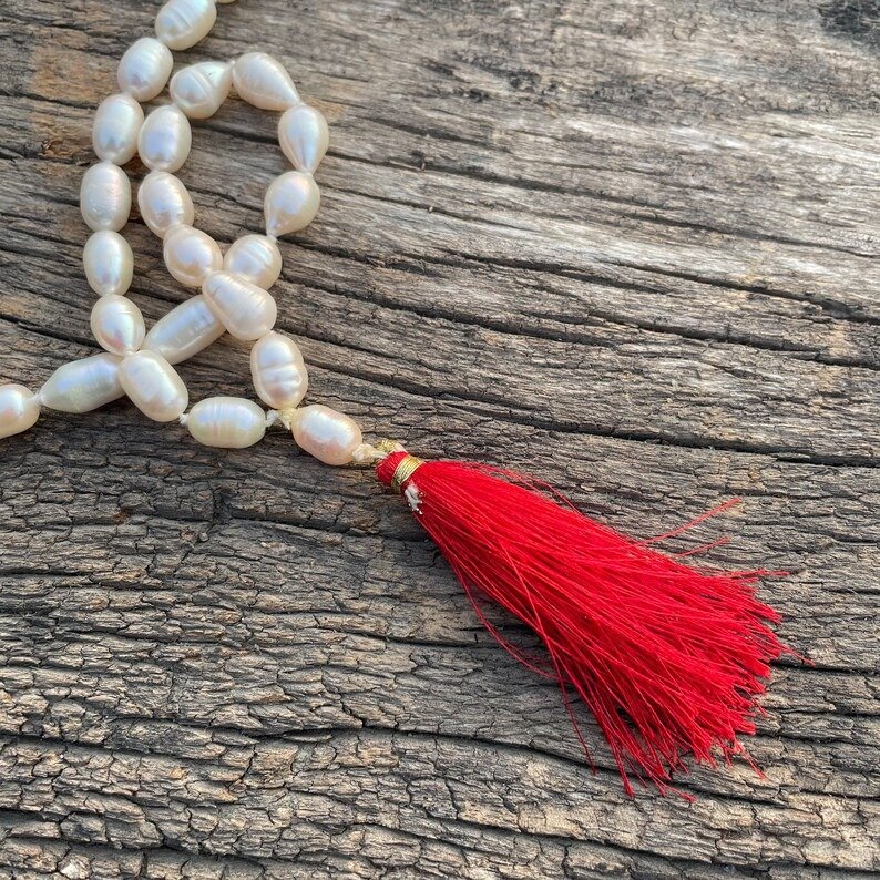 Natural Freshwater Pearl Mala – White Pearl Japa Mala with Red Tassel