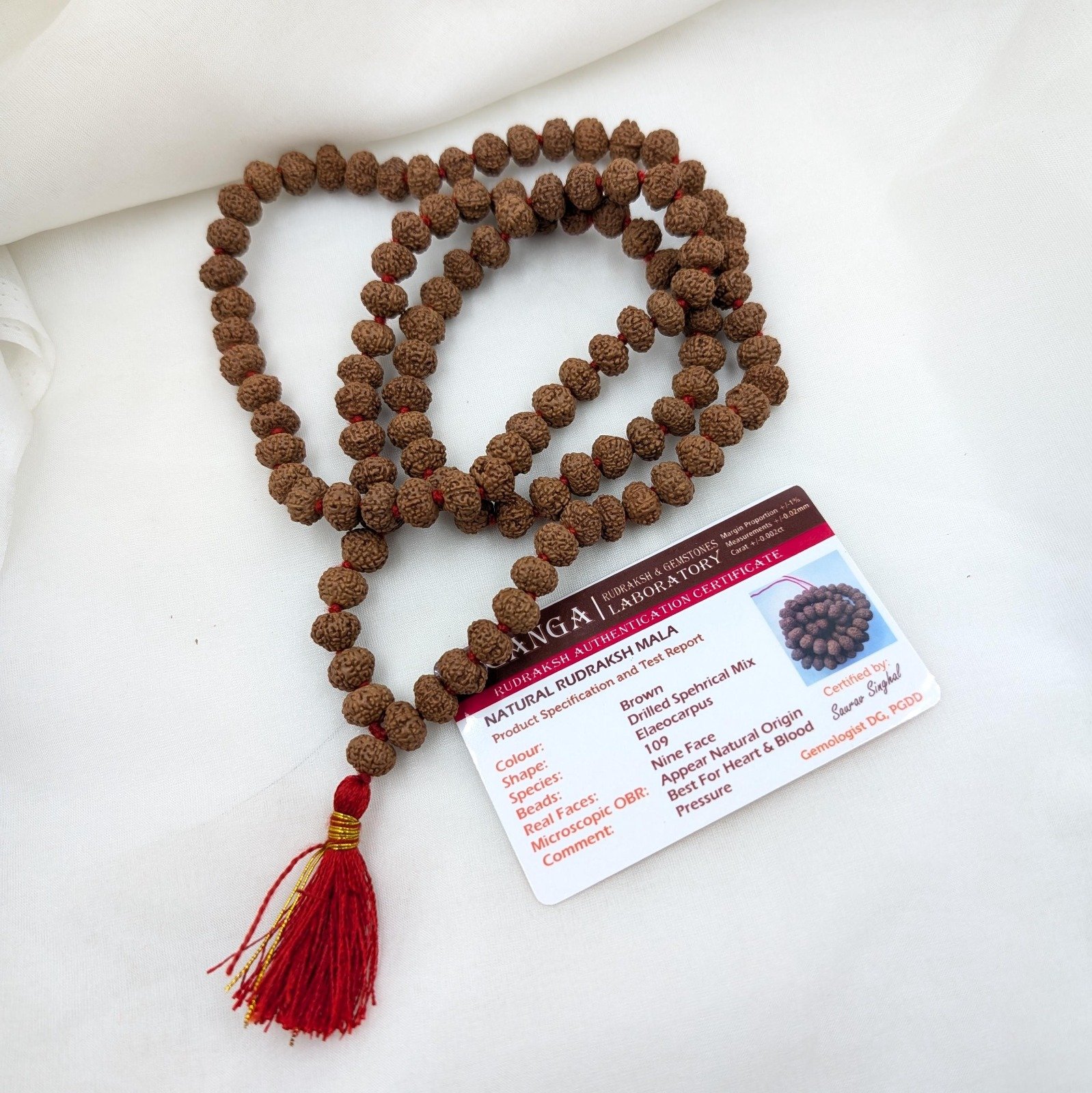 The 9 Mukhi Rudraksha Mala, featuring 109 authentic beads sourced from Indonesia. Each bead measures 10mm in size, crafted into an 18-inch long round necklace weighing approximately 44 grams. Accompanied by a lab certificate of authenticity, this Rudraksha mala is handmade with care to ensure the highest quality and spiritual significance. This 9 Mukhi Rudraksha mala is believed to bring prosperity, mental clarity, and peace to the wearer. The natural brown beads have a smooth, round shape making it comfortable to wear or use during japa meditation and spiritual rituals. Whether you seek inner calm or spiritual growth, this mala is a meaningful tool designed to support your journey.