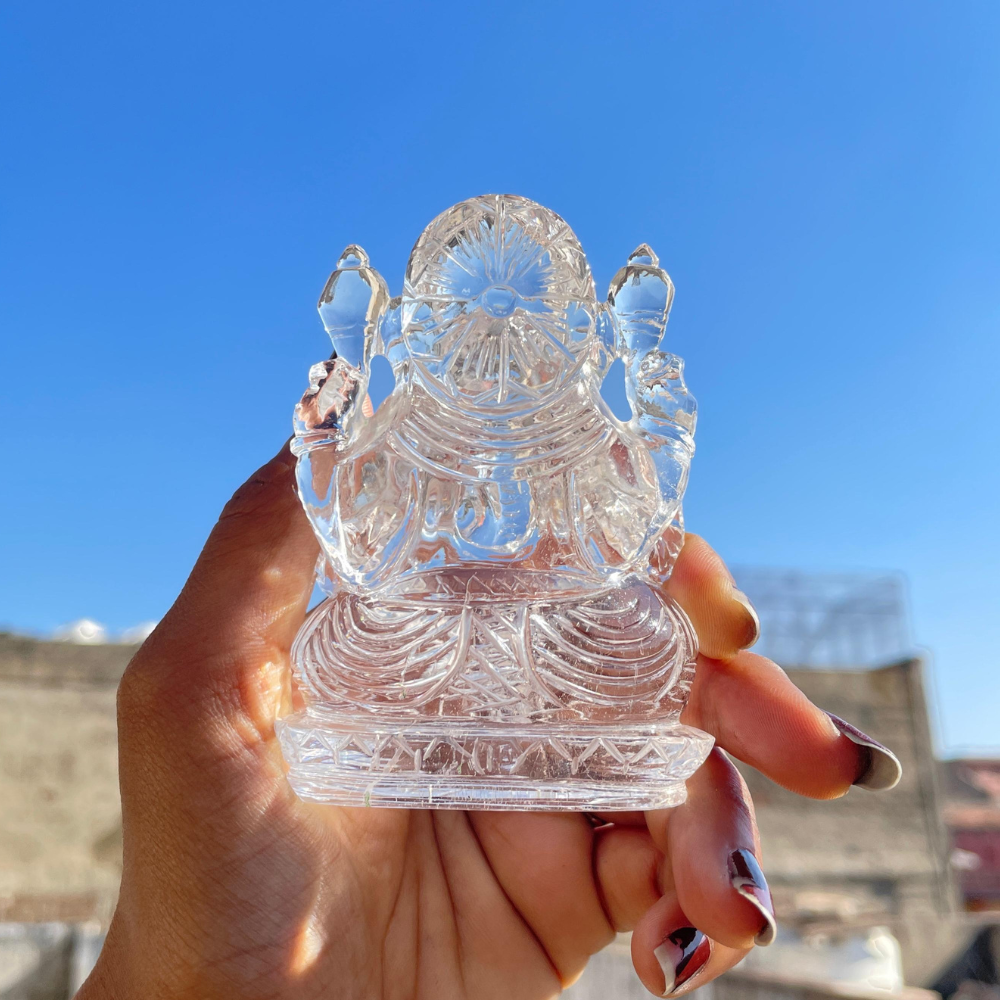 This beautiful Ganesha idol is intricately hand-carved from natural Sphatik (Crystal Quartz) by skilled artisans. The fine detailing, clarity, and radiant shine of the crystal make this piece truly divine. Sphatik Ganesha is highly revered for bringing positivity, wisdom, and spiritual protection into any space. Placing a Sphatik Ganesha in your home or prayer room is believed to remove obstacles, attract prosperity, and enhance inner peace