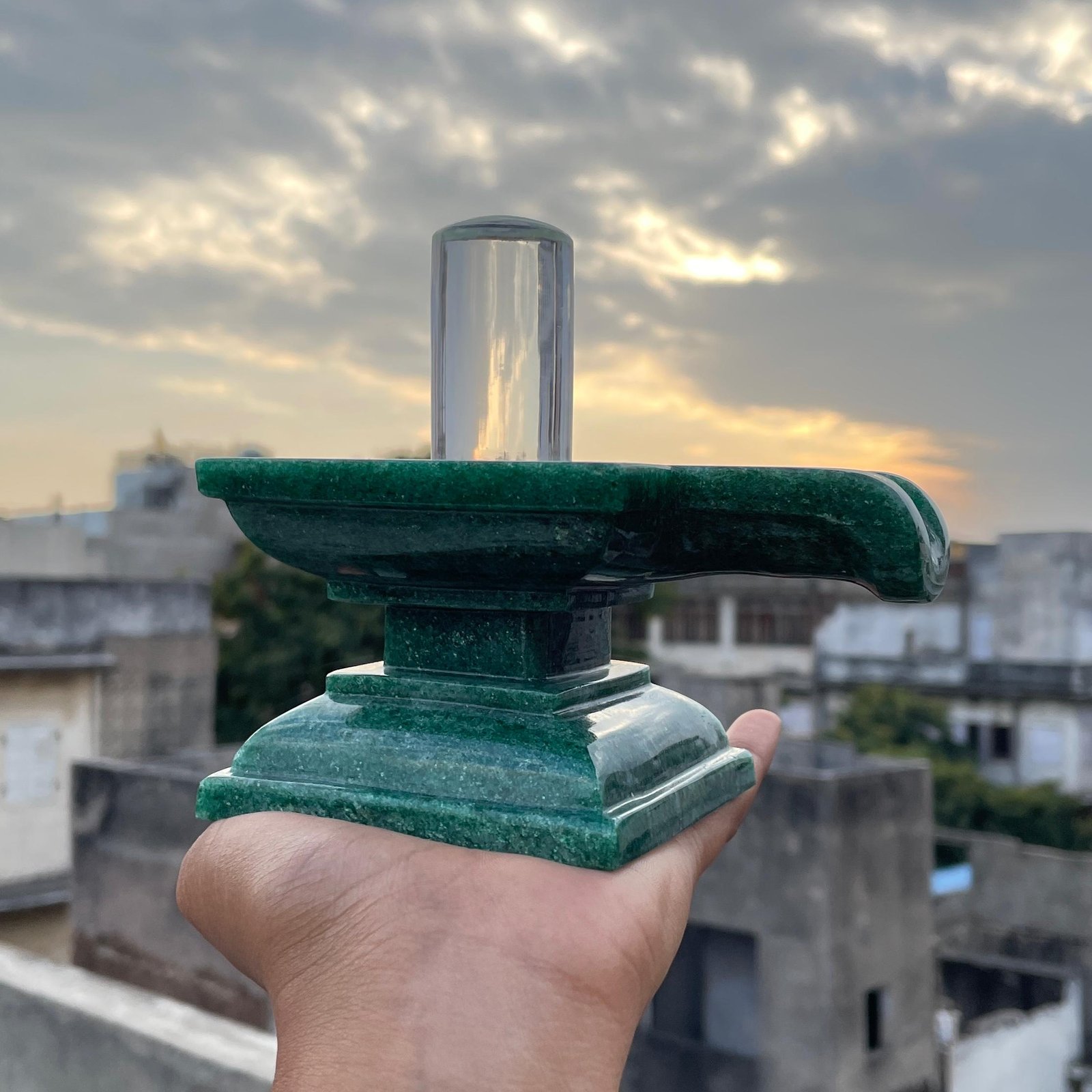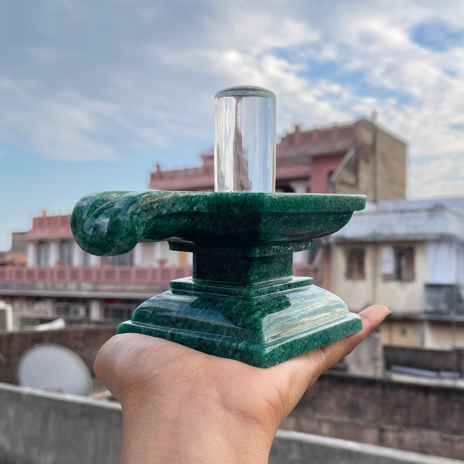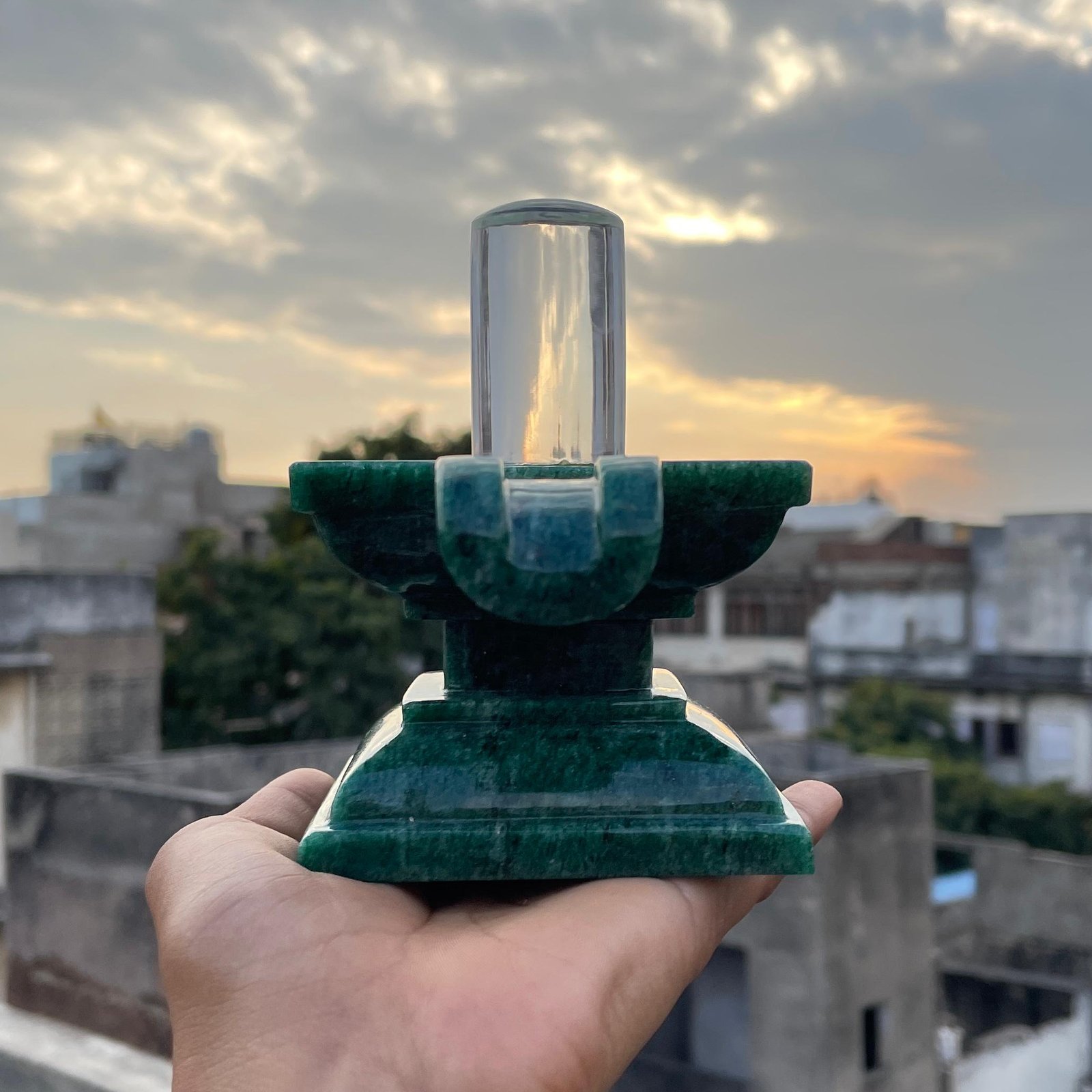 Invite divine blessings into your sacred space with this exquisite hand-carved Crystal Lingam, gracefully placed on a pure Green jade Stone Base. A powerful symbol of Lord Shiva, this spiritual masterpiece is perfect for pooja rooms, meditation spaces, temples, and energy healing rituals.
