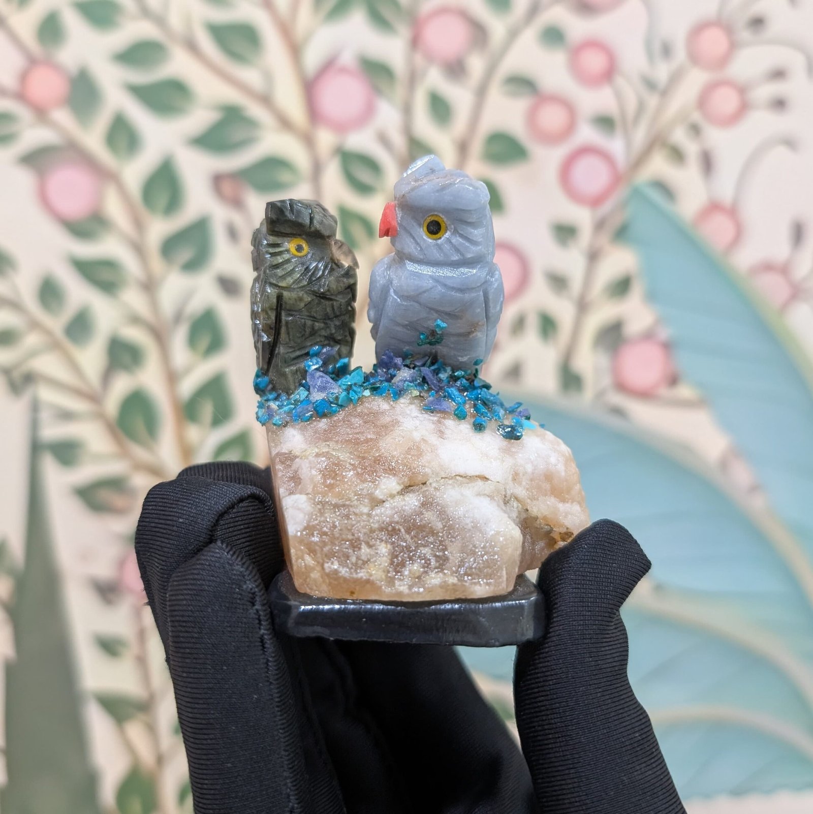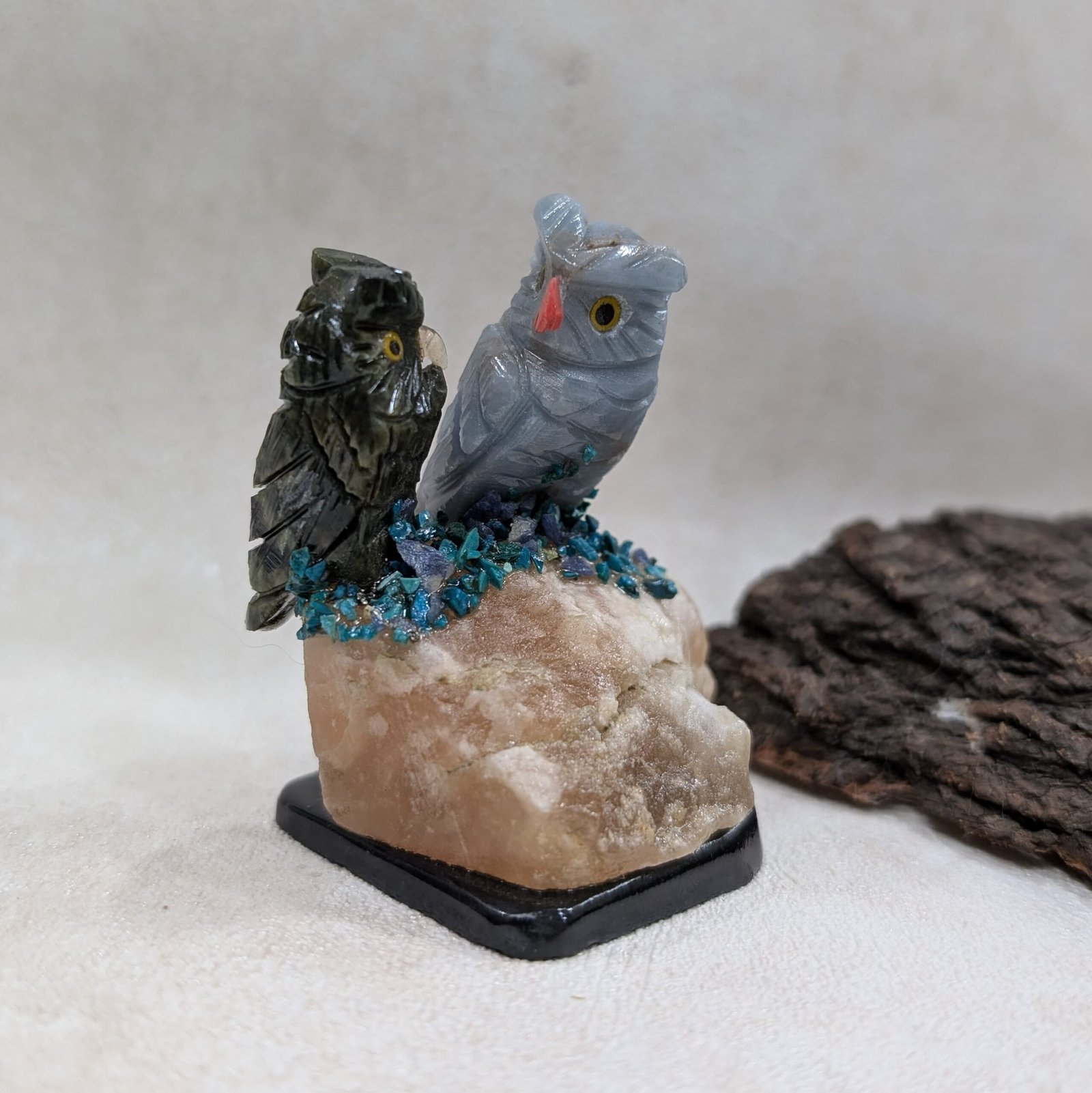 Bring harmony and charm to your space with this exquisite hand-carved Owl Pair Figurine, crafted from natural gemstones. Each owl is meticulously sculpted—one in earthy green stone and the other in soft grey—with striking yellow eyes and a coral-red beak, perched gracefully on a raw quartz cluster base. Accented with vibrant crystal chips, this piece radiates both earthy energy and artistic finesse.