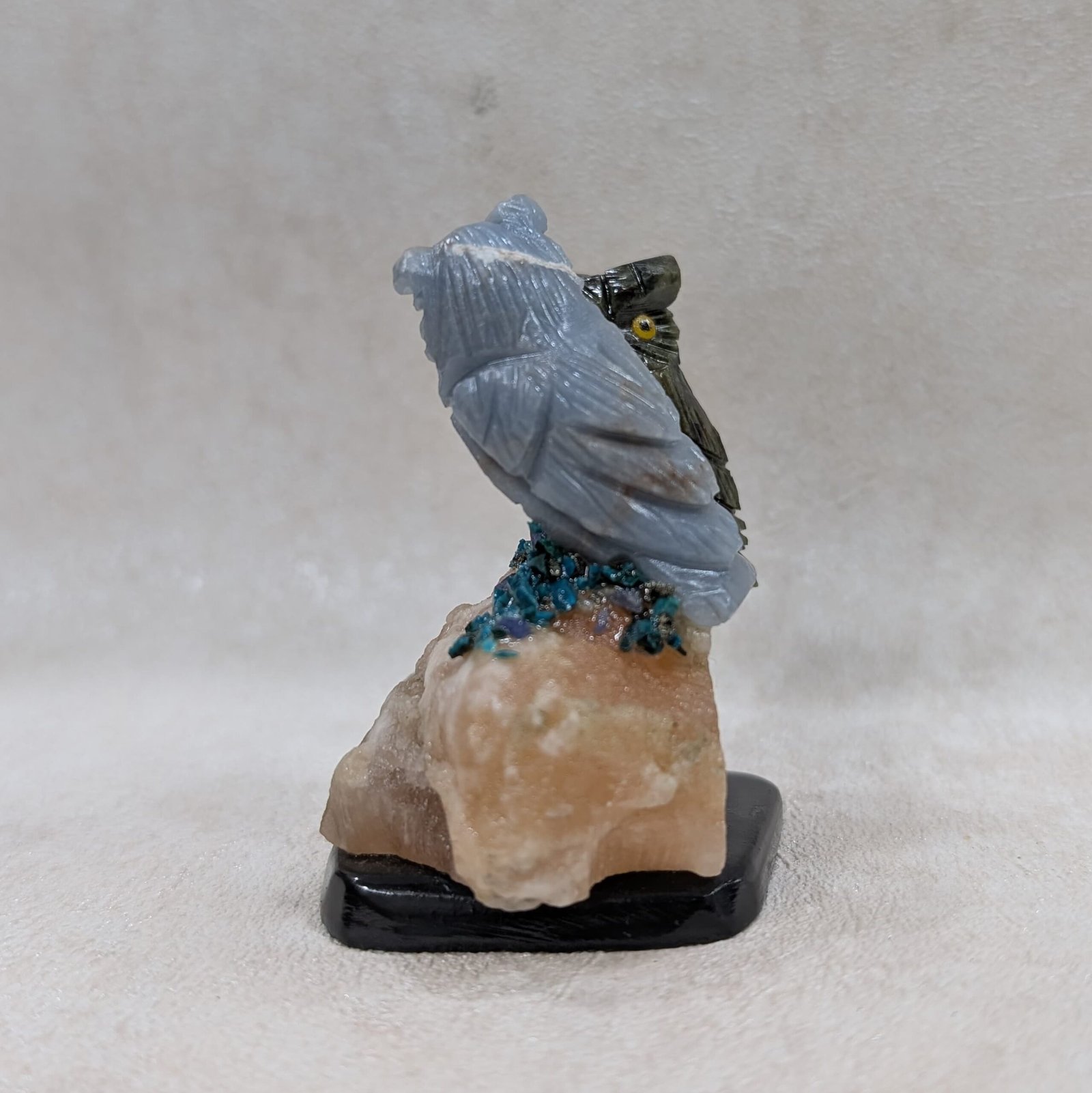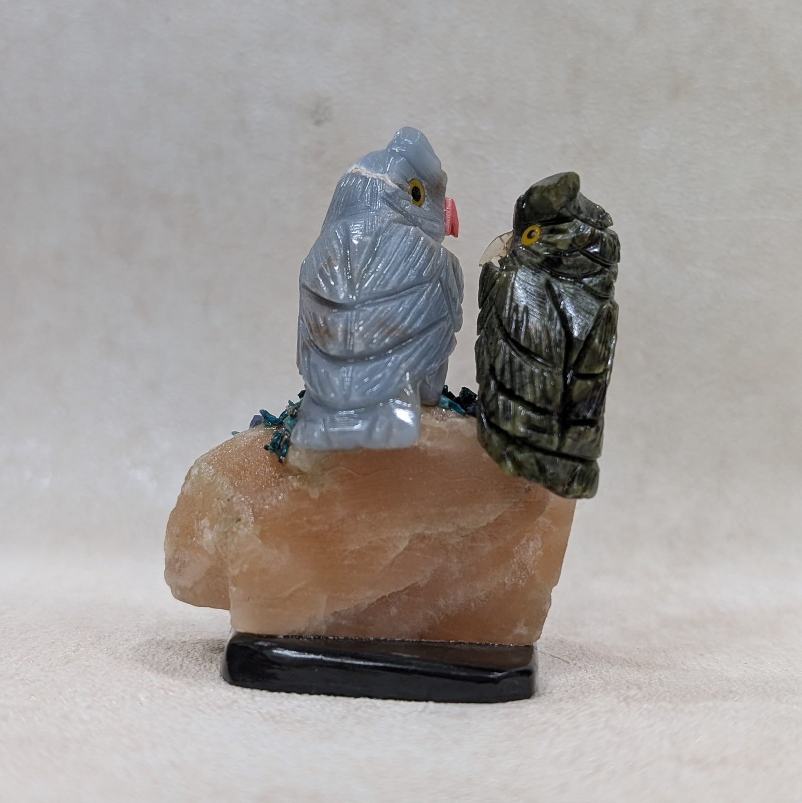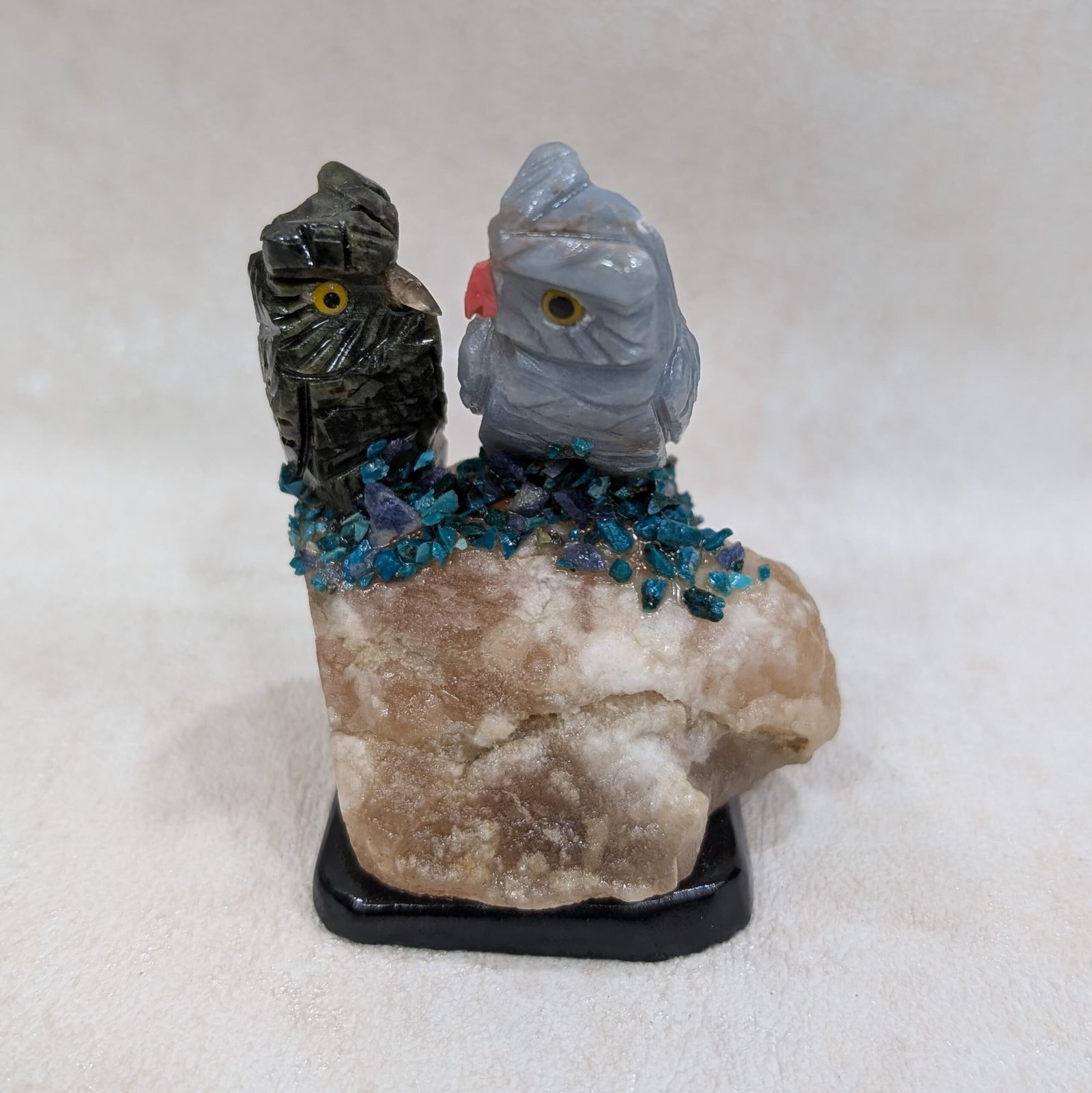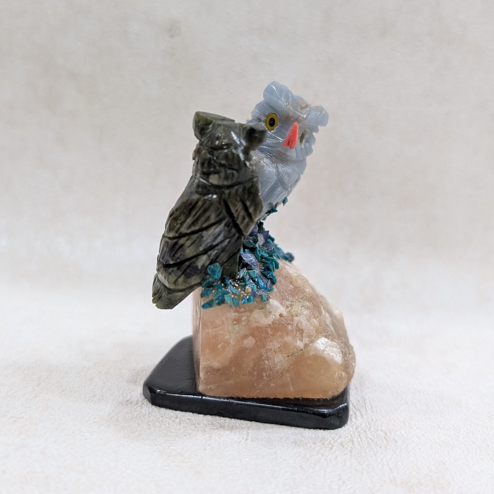 Gemstone Owl Figurine, Hand-Carved Birds on Quartz Base