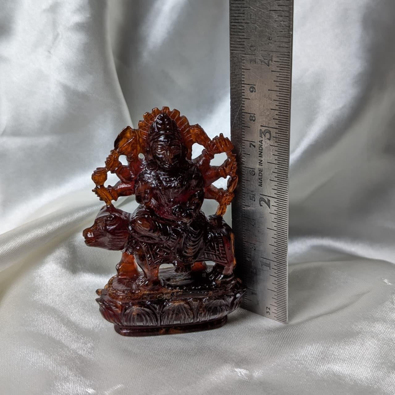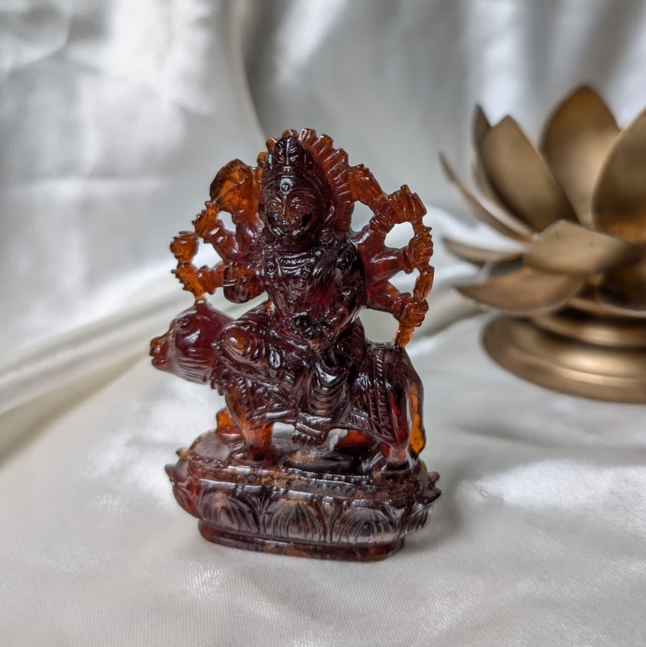 This Beautiful Durga Idol is carved in Natural Hessonite Stone. According to Hindus, worshipping Maa Durga, the goddess of strength, protection, and courage, can bring many benefits to devotees.