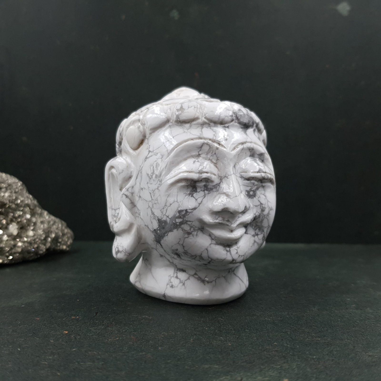 Howlite Buddha Head is likely referring to a Buddha head sculpture made from Howlite, a mineral that is often used in jewelry and decorative items. Howlite is known for its calming and healing properties, and it is sometimes used in spiritual or metaphysical contexts. When carved into a Buddha head, it combines the peaceful symbolism of the Buddha with the energy of the mineral.