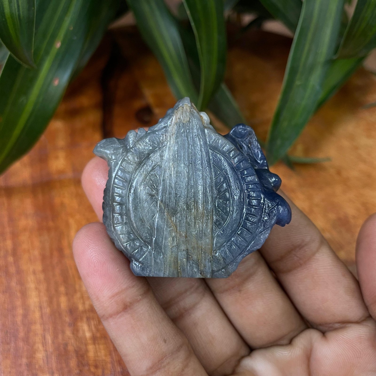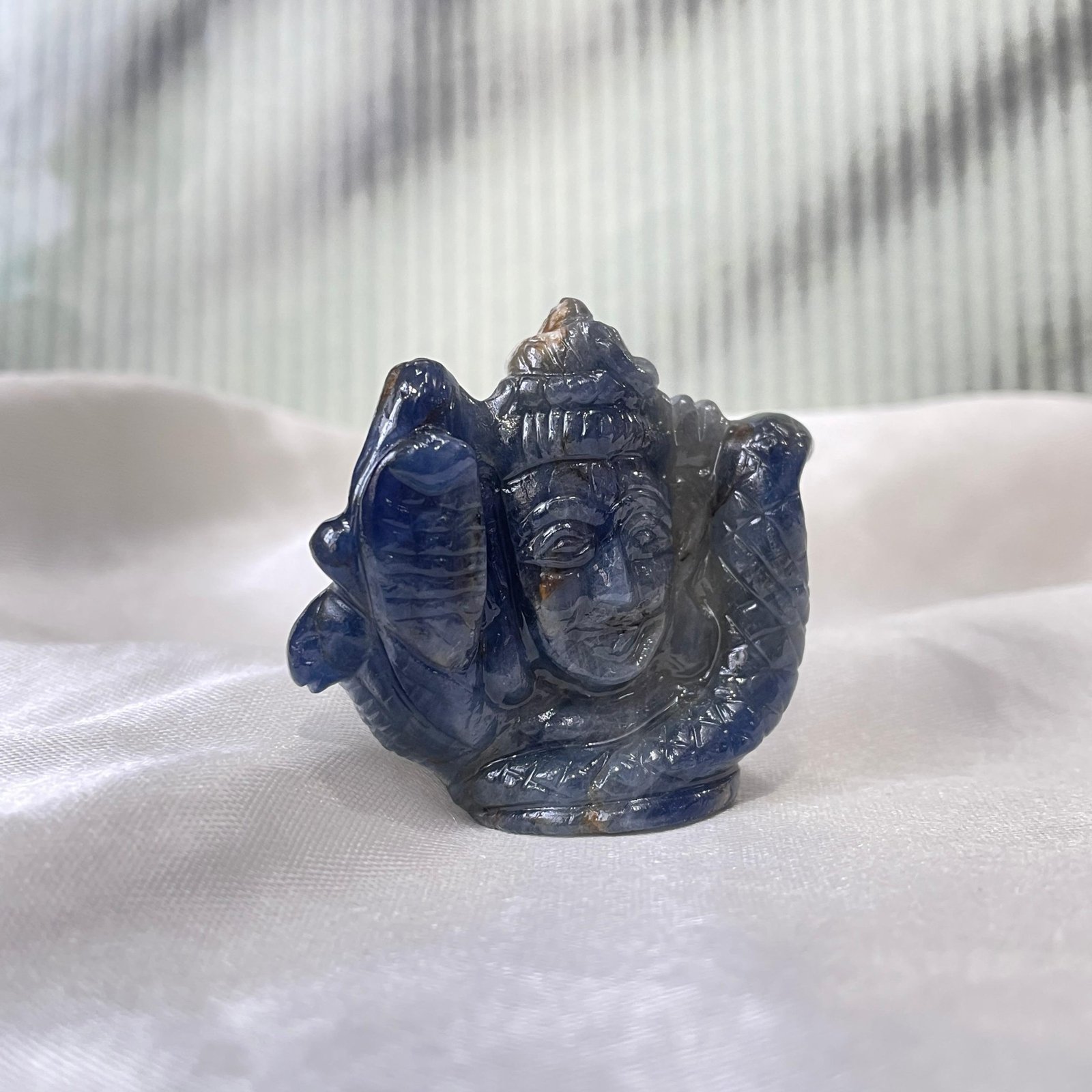 The deep greyish-blue tone of blue sapphire adds a powerful, serene presence, while the detailed carving reflects fine craftsmanship and devotion.