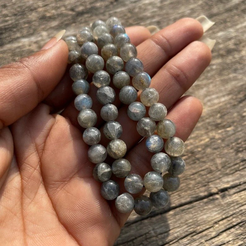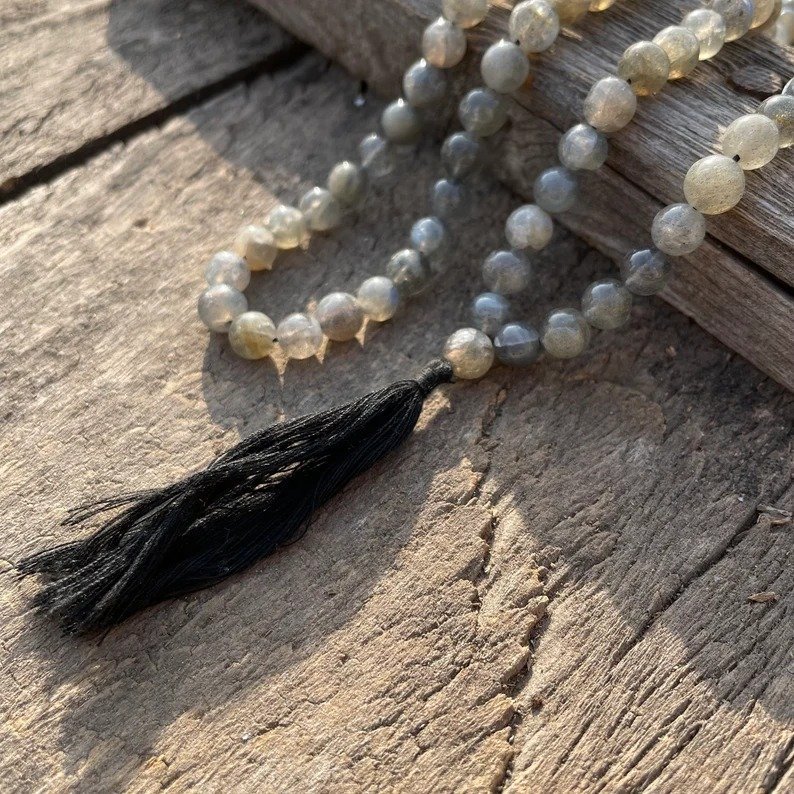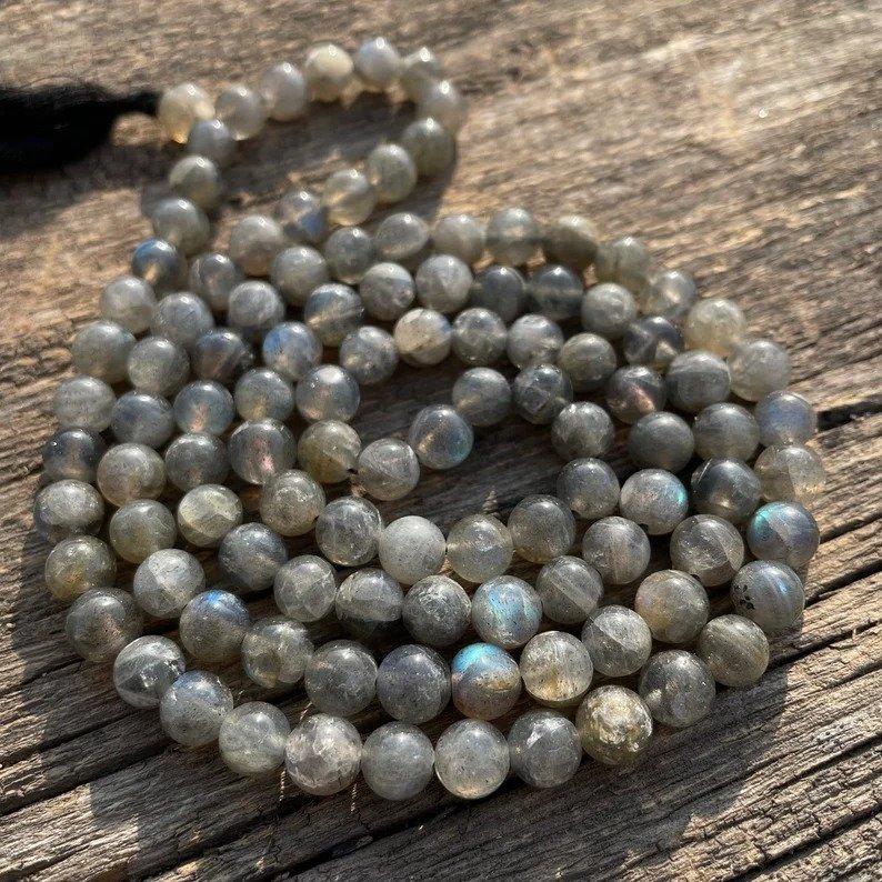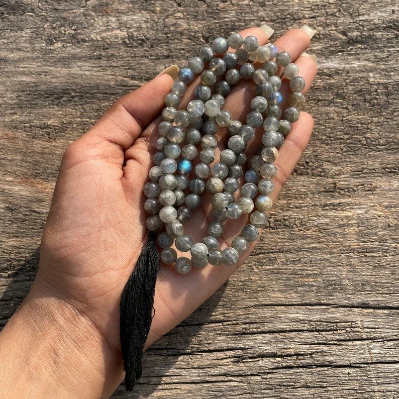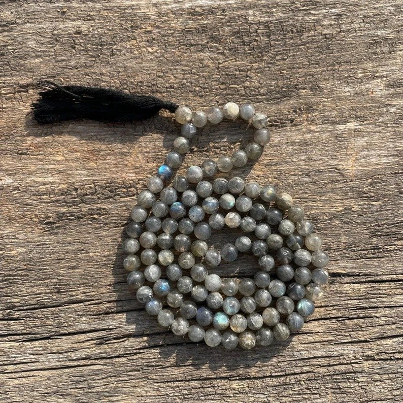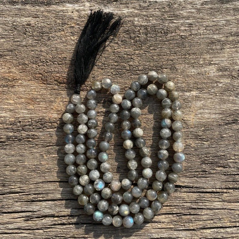 Labradorite is a mystical and captivating gemstone known for its iridescent play of colors, often exhibiting hues of blue, green, gold, and even purple. A Labradorite mala (a string of prayer beads) is often used in spiritual and healing practices.