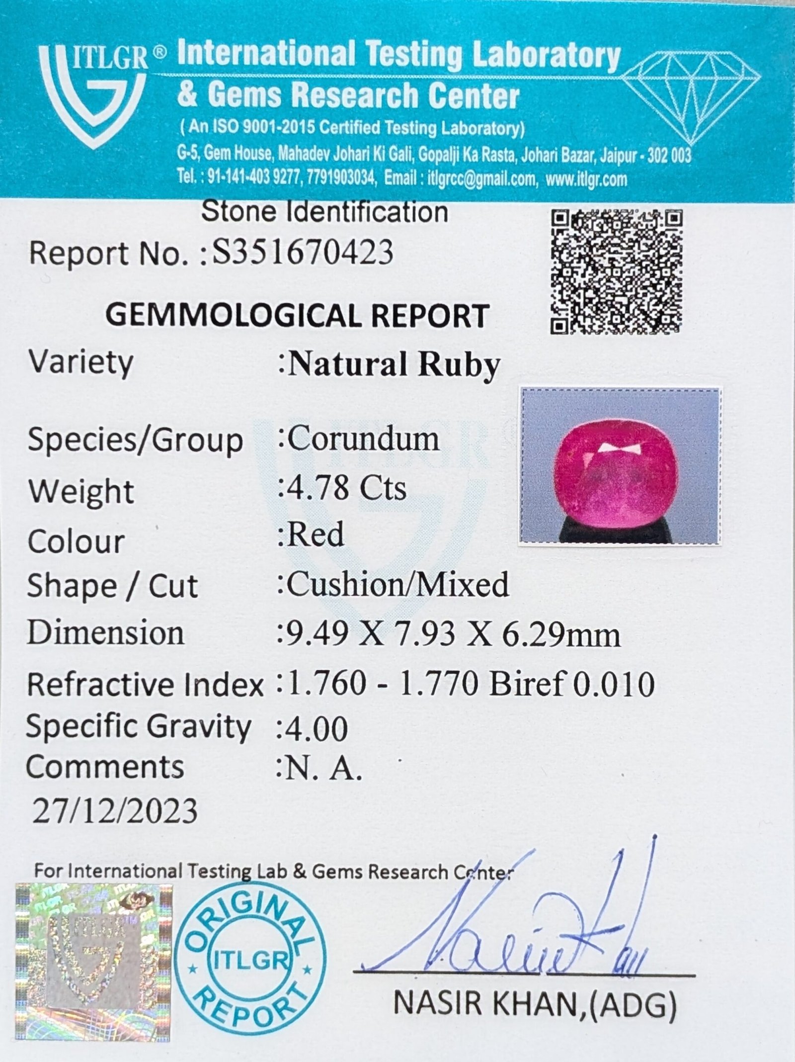 | Certification | ITLGR – International Testing Laboratory & Gems Research Centre (Jaipur) |