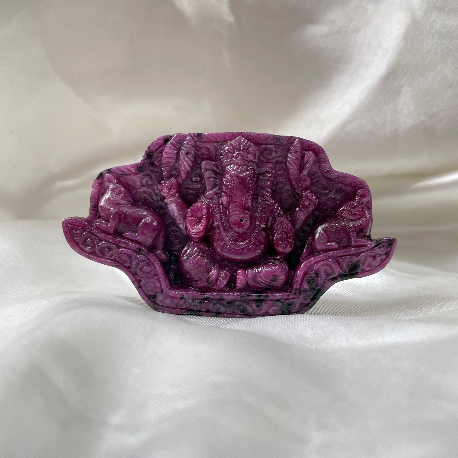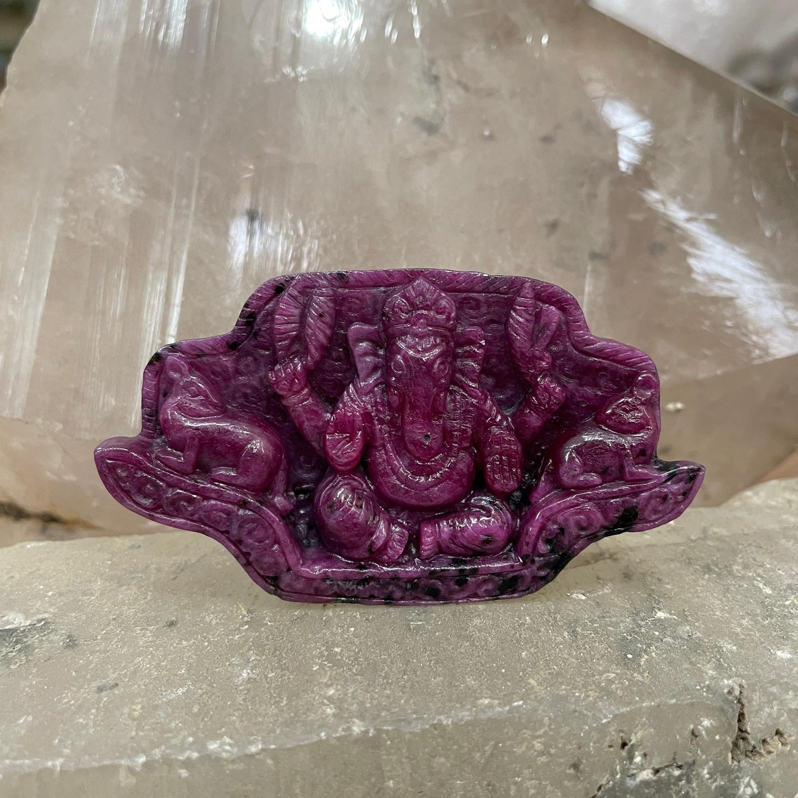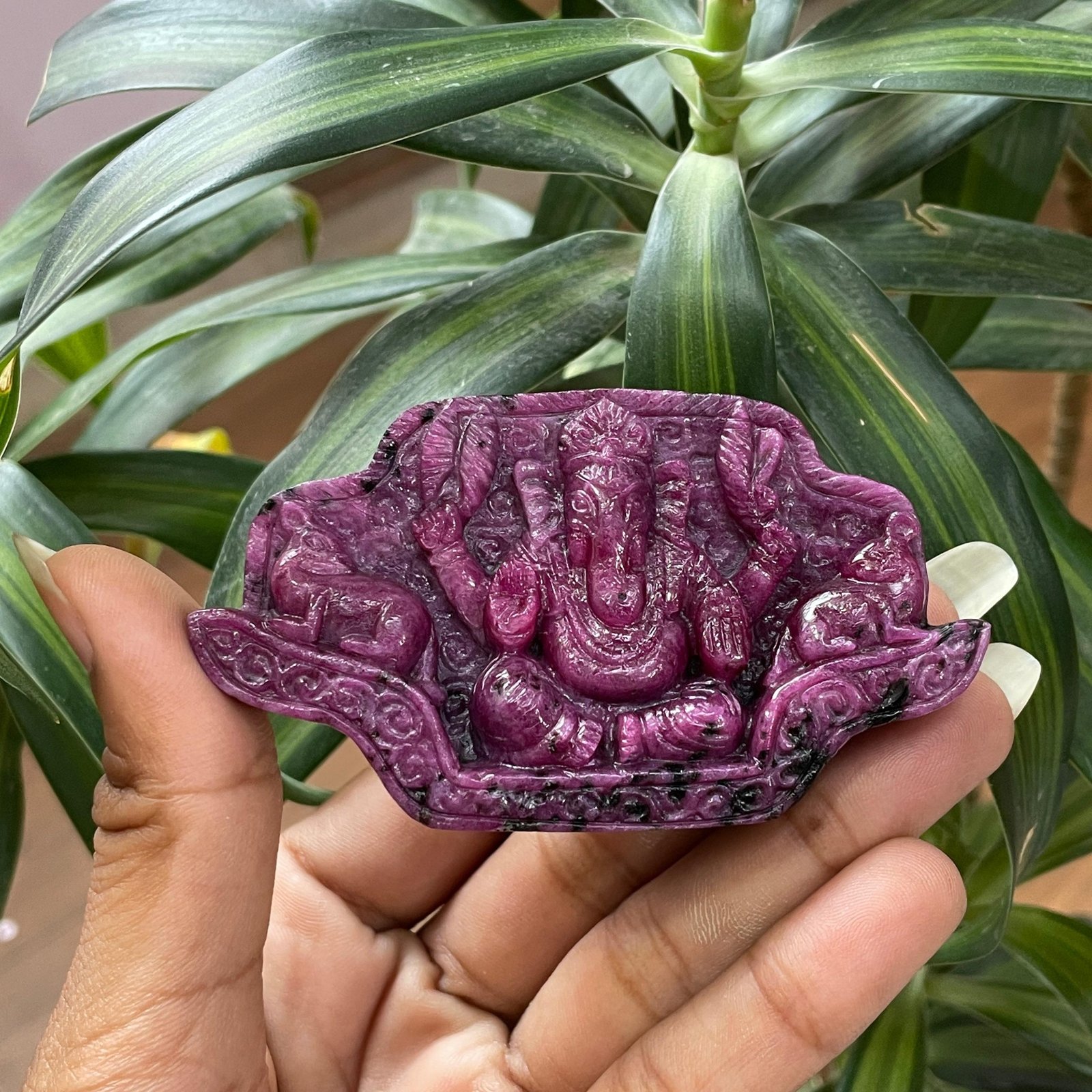Each piece is uniquely carved by skilled artisans, making it a one-of-a-kind spiritual and decorative collectible. The rich natural pink-to-purple tones of ruby add elegance and depth, perfect for a home altar, office desk, meditation space, or spiritual décor.