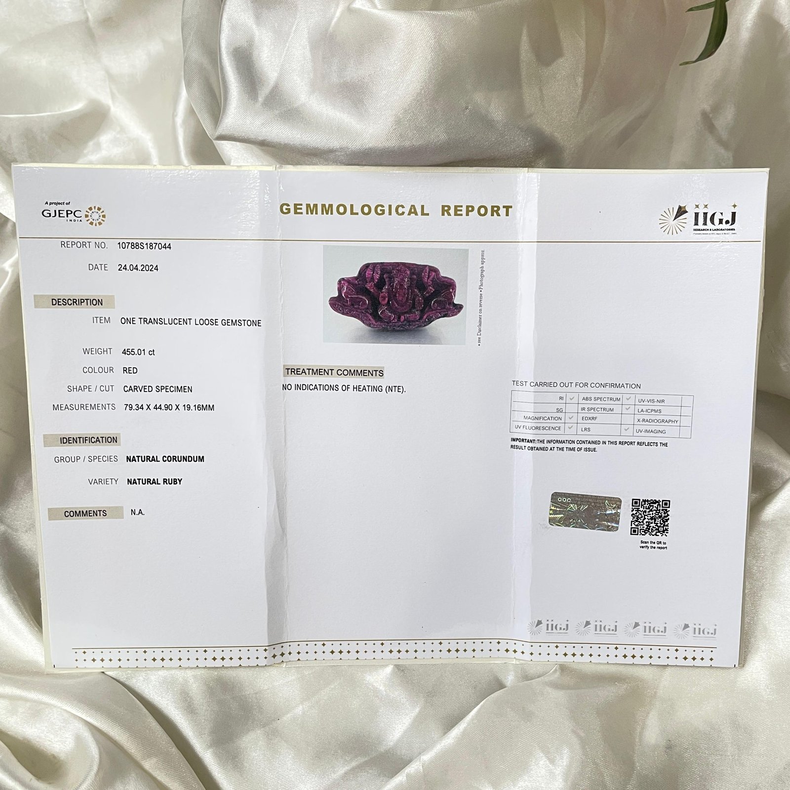 This Ruby Ganesh statue made in natural ruby gemstone. It is certified by IIGJ lab in Jaipur. It is carved both side by expert artisan and It has not applied any color or treatment. It is 100% natural Ruby gemstone.