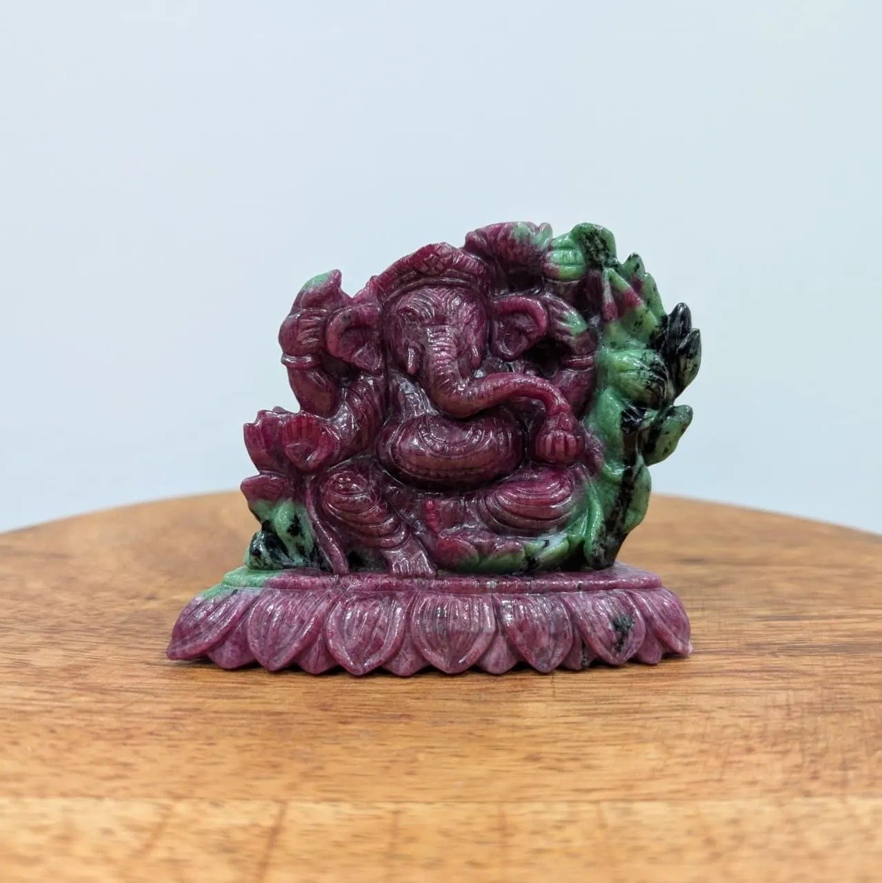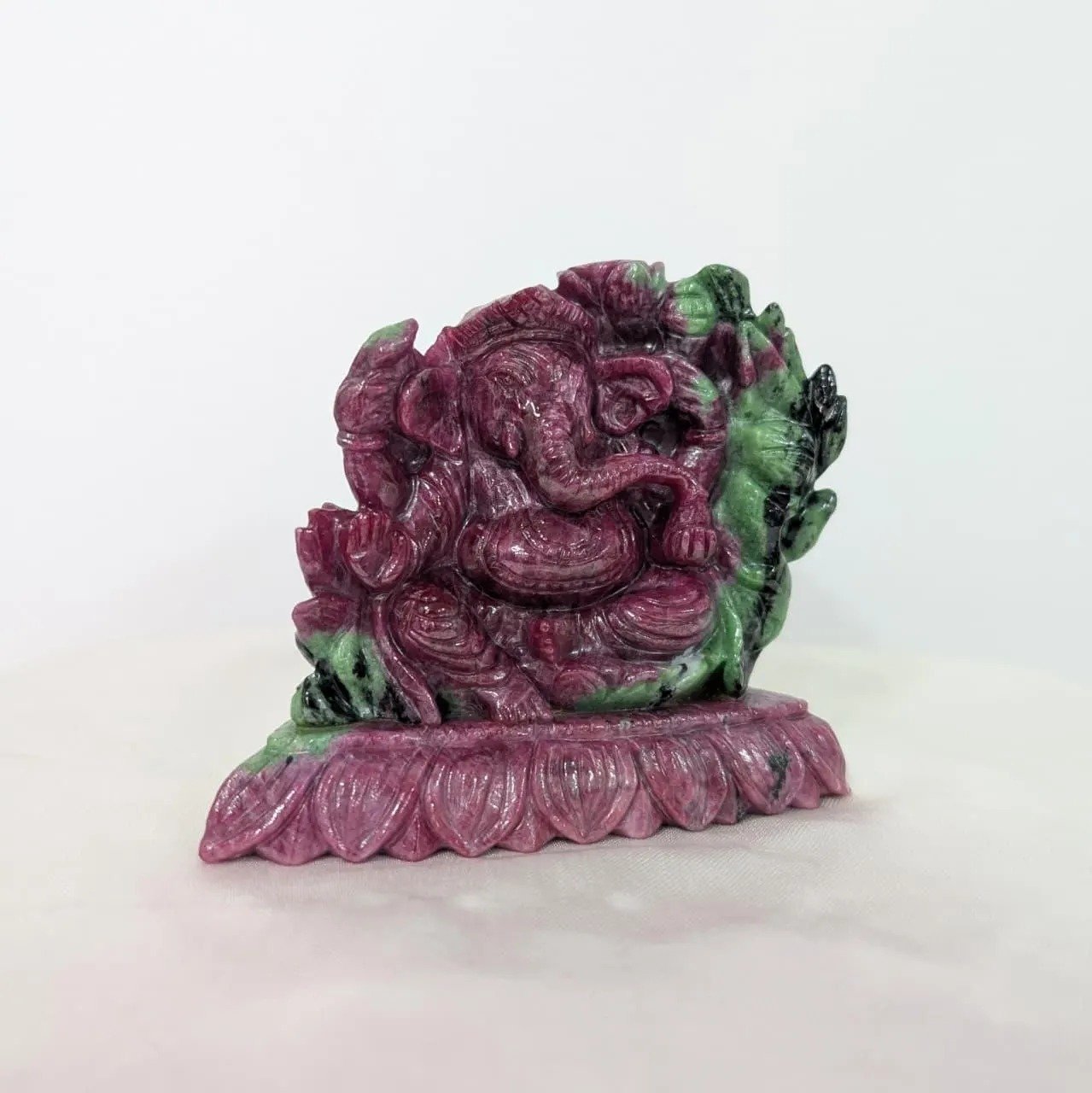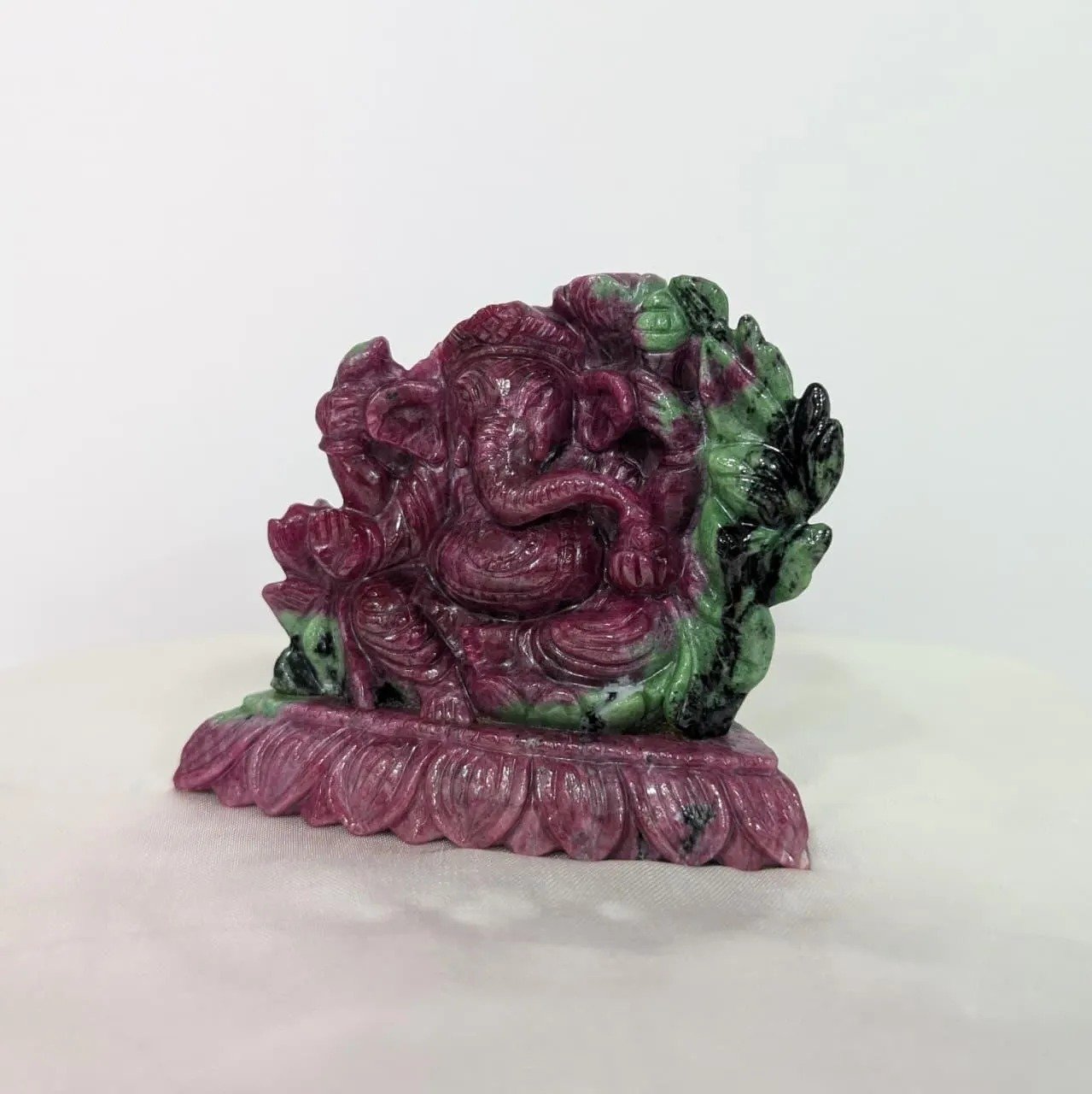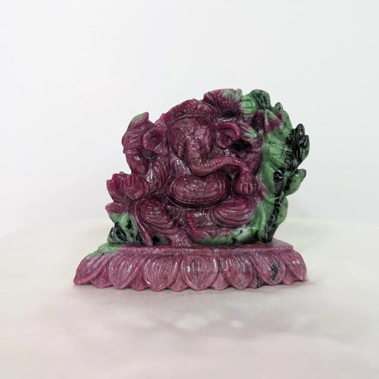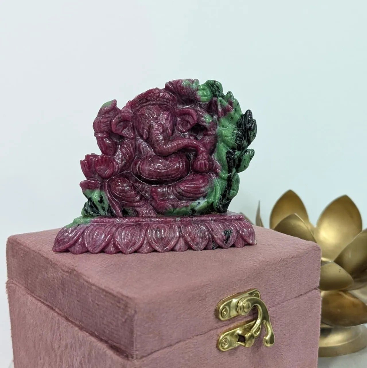 • Bring divine blessings and vibrant energy into your space with this exquisite Ruby Ganesha idol, beautifully hand-carved from natural Indian ruby stone.