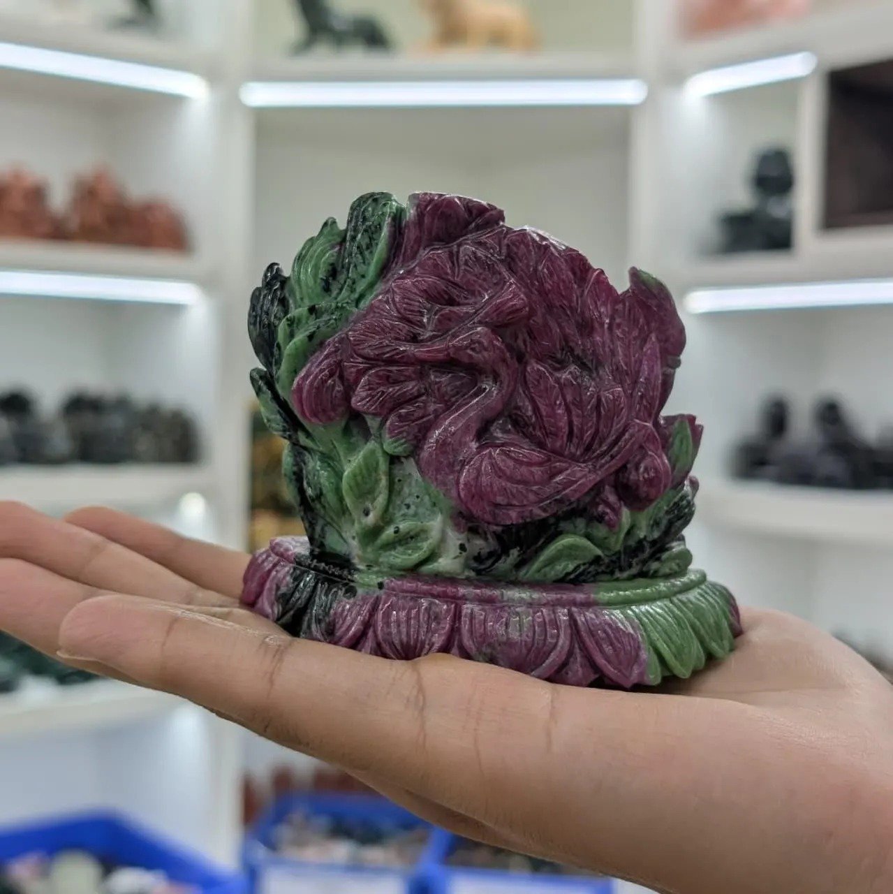 • Each carving is meticulously polished by skilled artisans to highlight the natural brilliance and deep red hue of the ruby crystal.