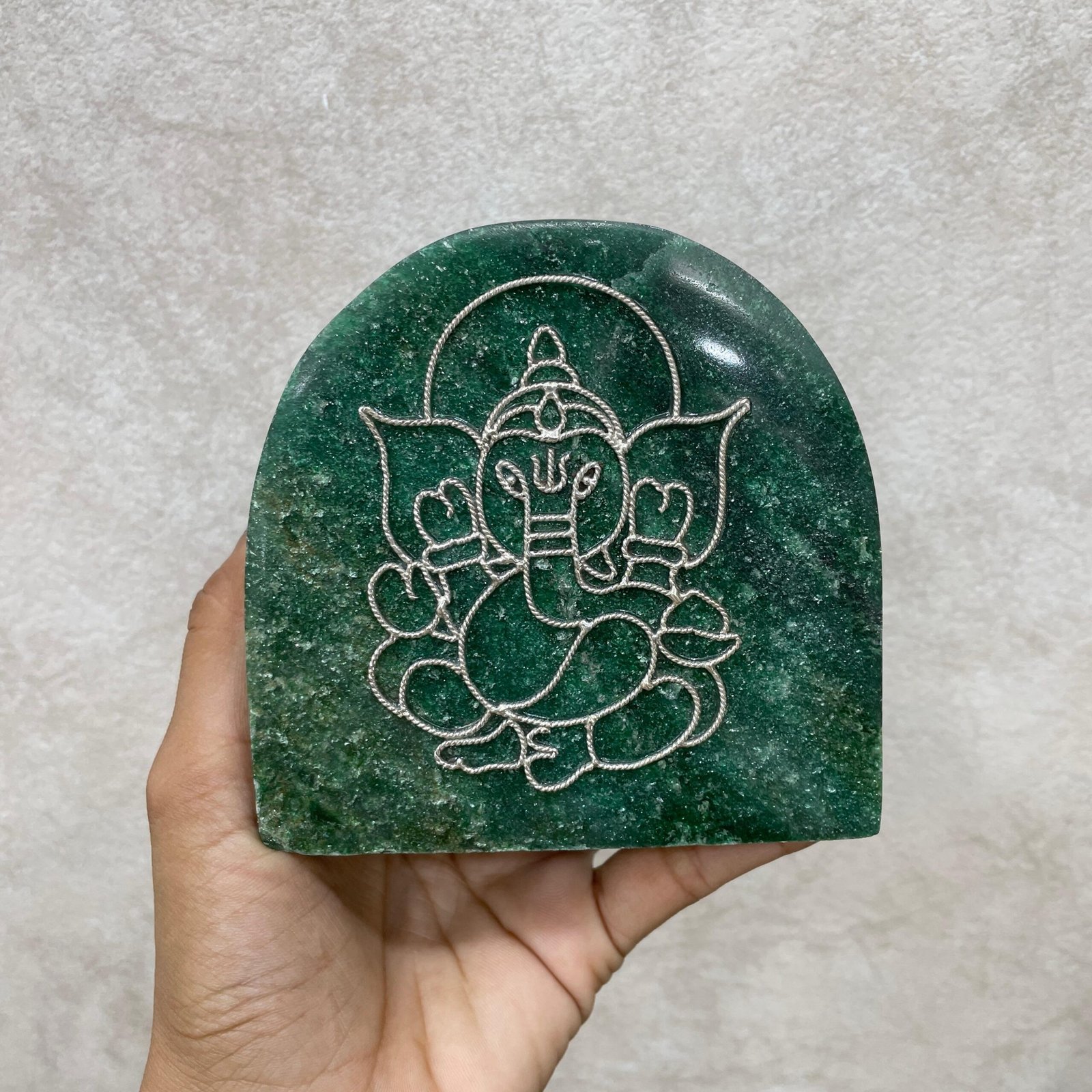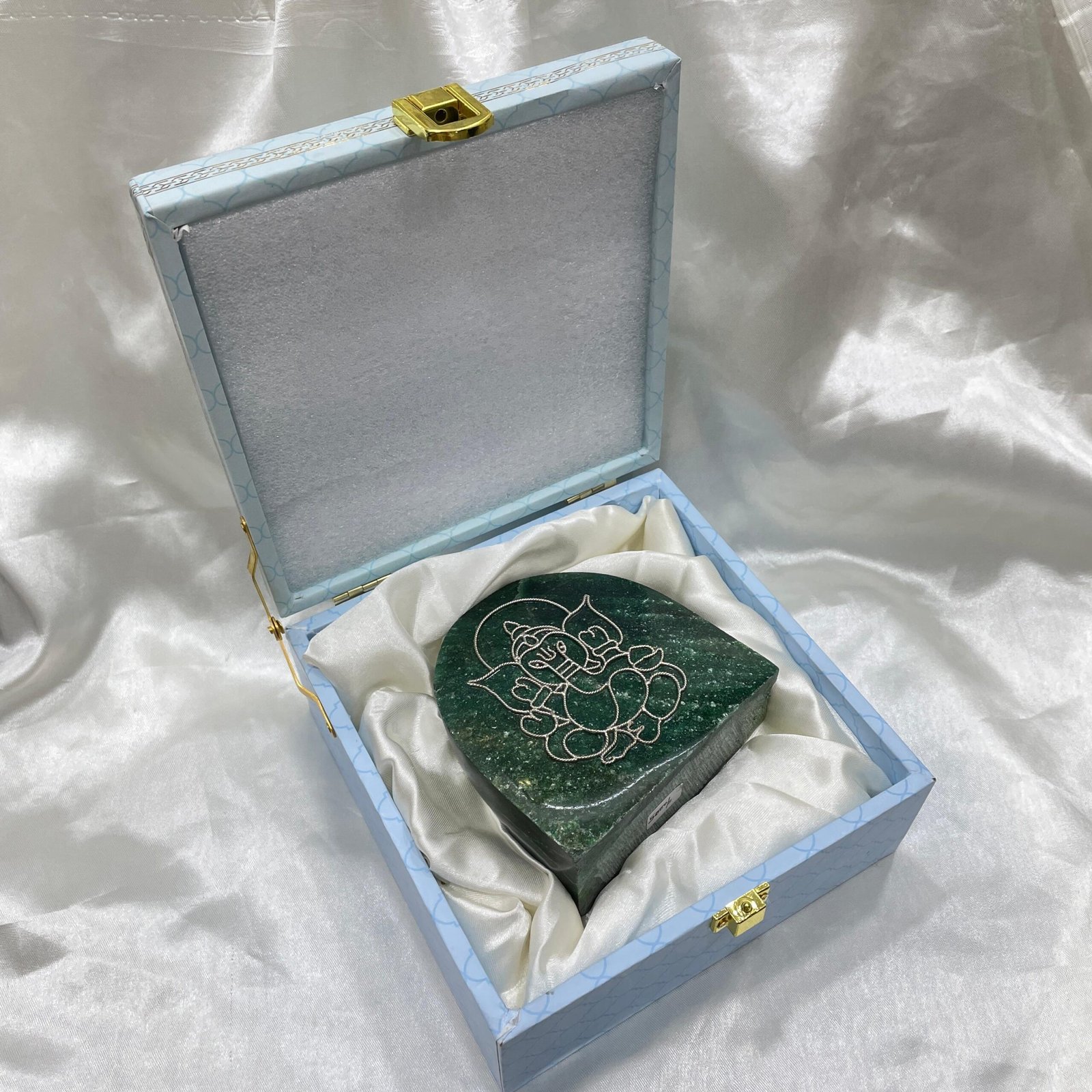 Each Silver Ganesha on Green Jade Stone is meticulously handcrafted by skilled artisans. The detailed carving of Ganesha, paired with the polished jade base, ensures that every idol is unique, spiritually potent, and visually captivating. This makes it a treasured spiritual artifact for homes, offices, and meditation spaces.
