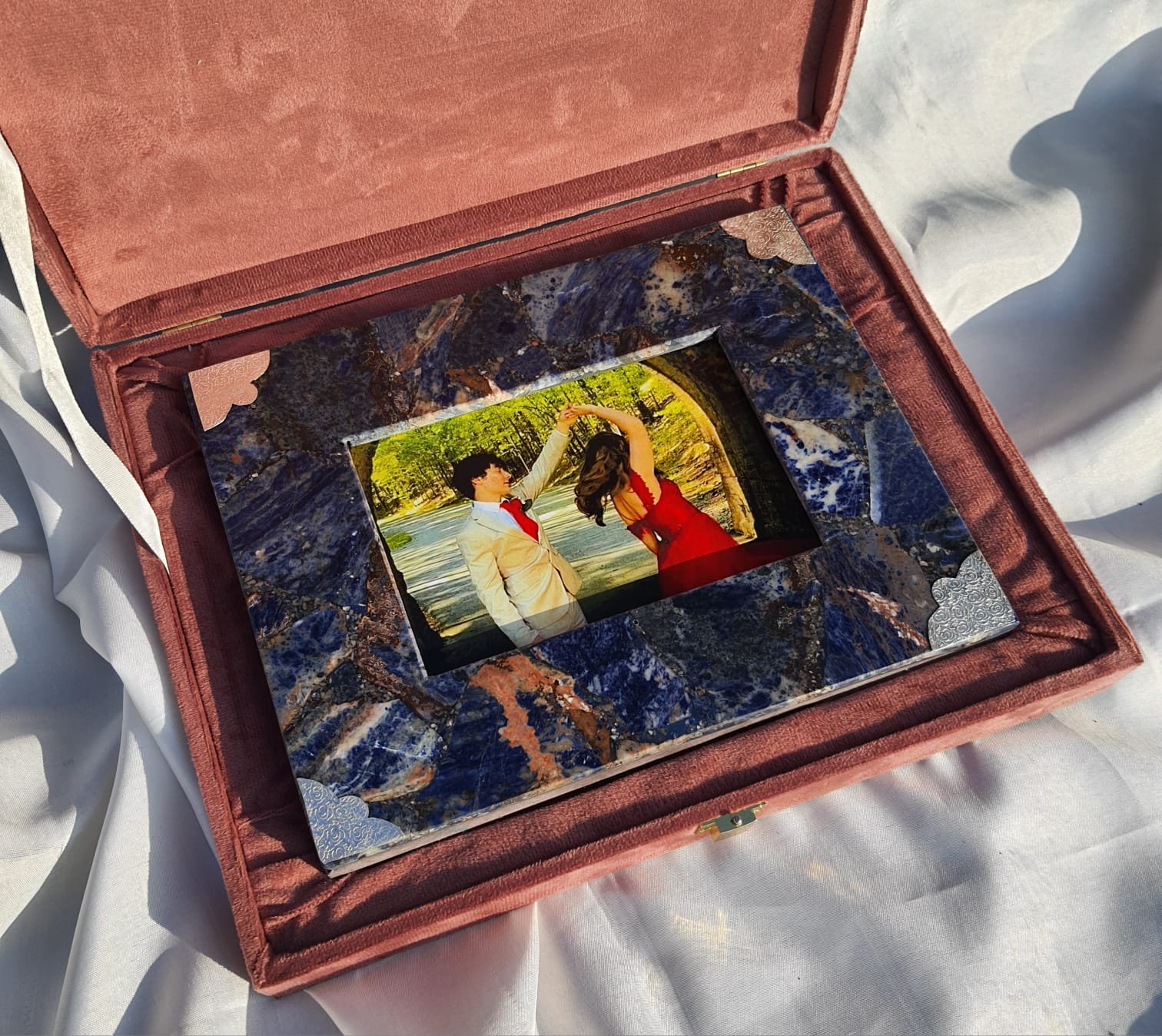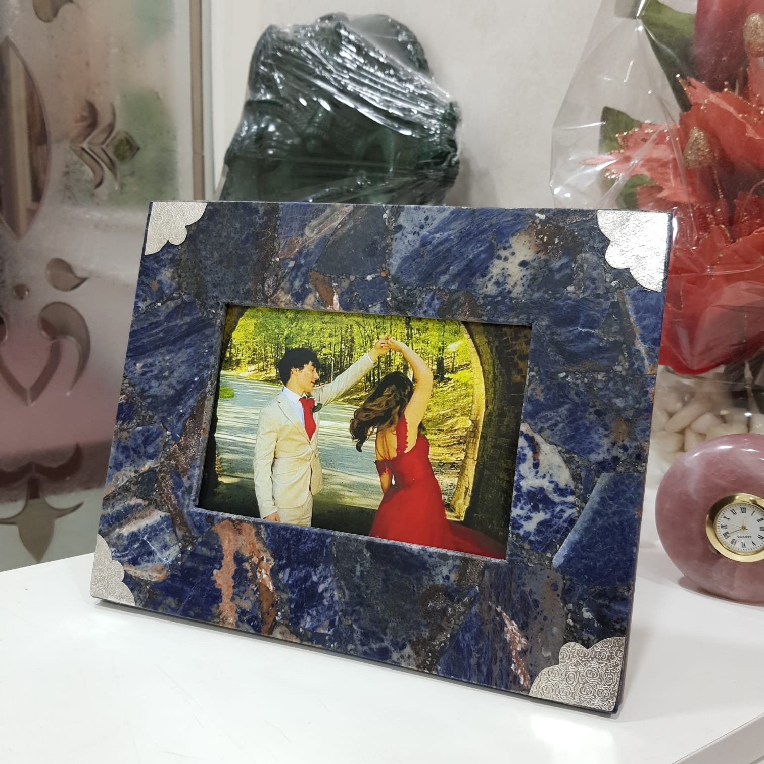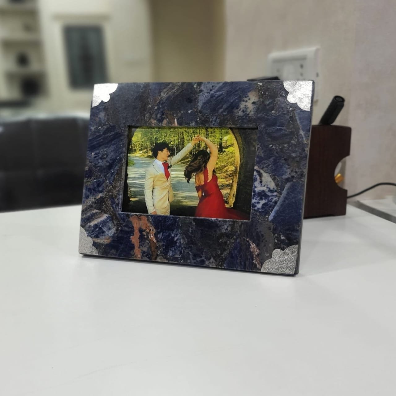 Showcase your cherished memories in this luxurious, handcrafted sodalite frame. Featuring deep blue, white, and earthy patterns with elegant silver-toned corner inlays, each frame is unique and polished to perfection. Perfect for home décor, office desks, meditation spaces, or gifting, it adds natural beauty, sophistication, and a calming presence to any space.